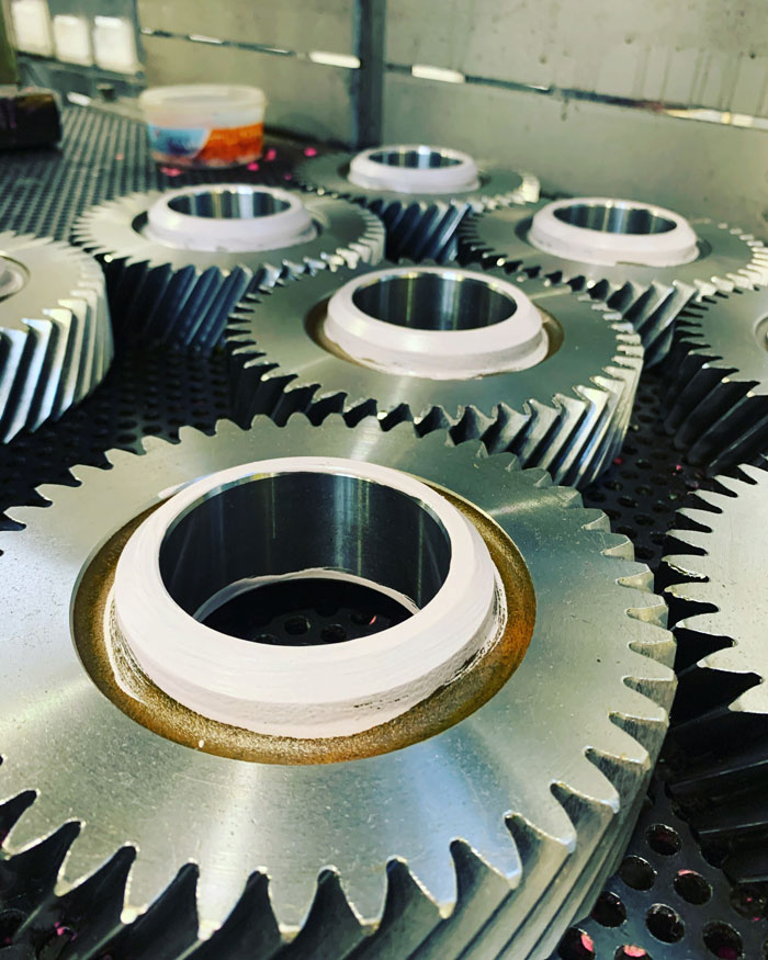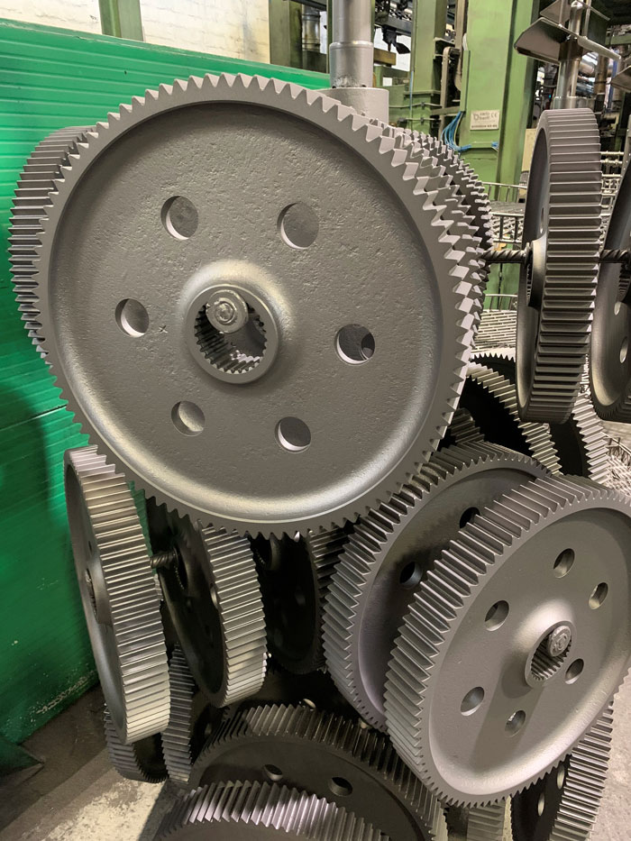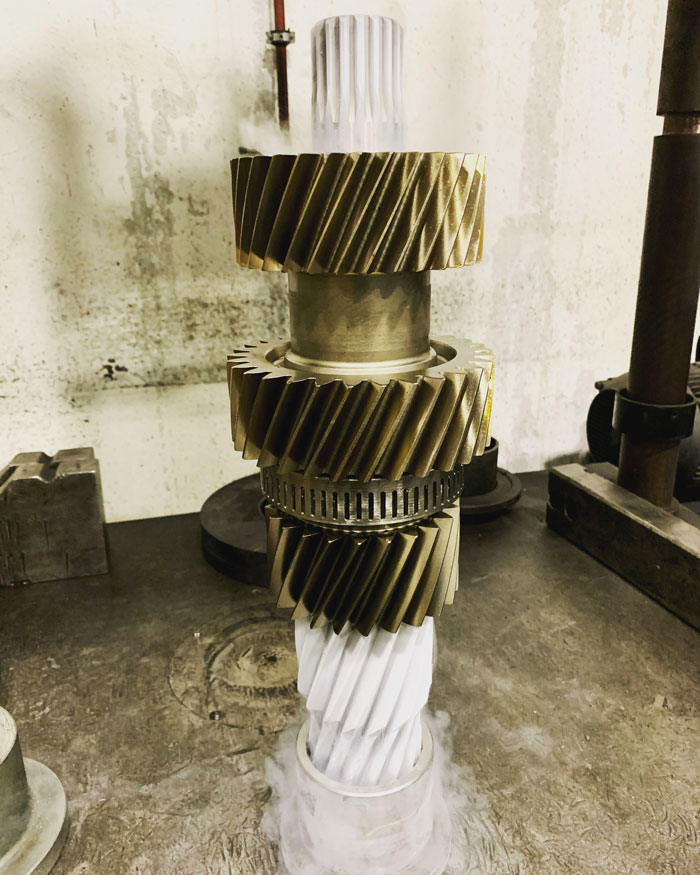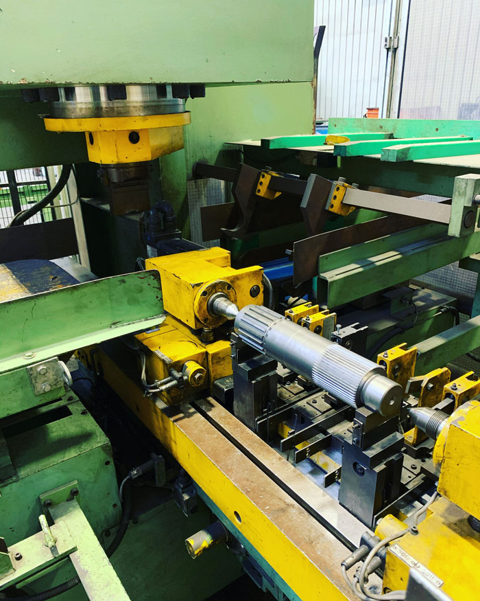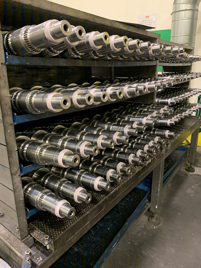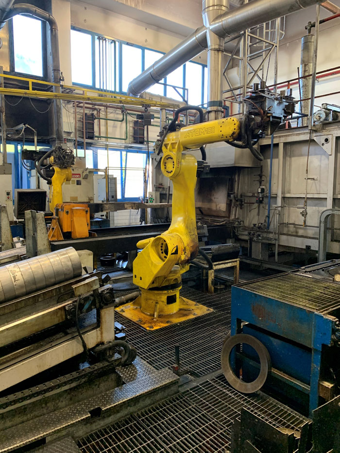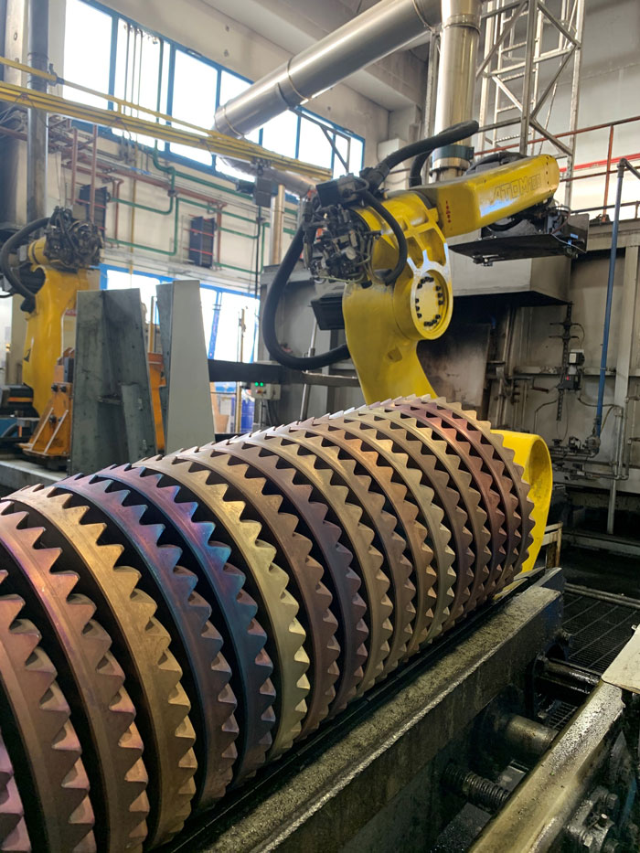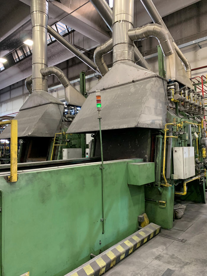 Si tratta di forni a camera in linea del tutto simili e sono dotati di un’unica camera di riscaldo per il trattamento termico, seguita da una camera di tempra in cui i pezzi sono immersi in olio. - 1 impianto di tempra in pressa robotizzato